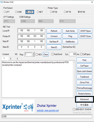 Step 7. Change the printer port from NET to USB, and click on Advanced.