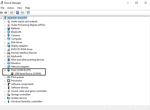 Step 9. Close the utility and chick on windows, type device manager and open it. Click the dropdown menu of Ports (COM & LPT). Take a note of the COM Port and assign it in the POSCraft.